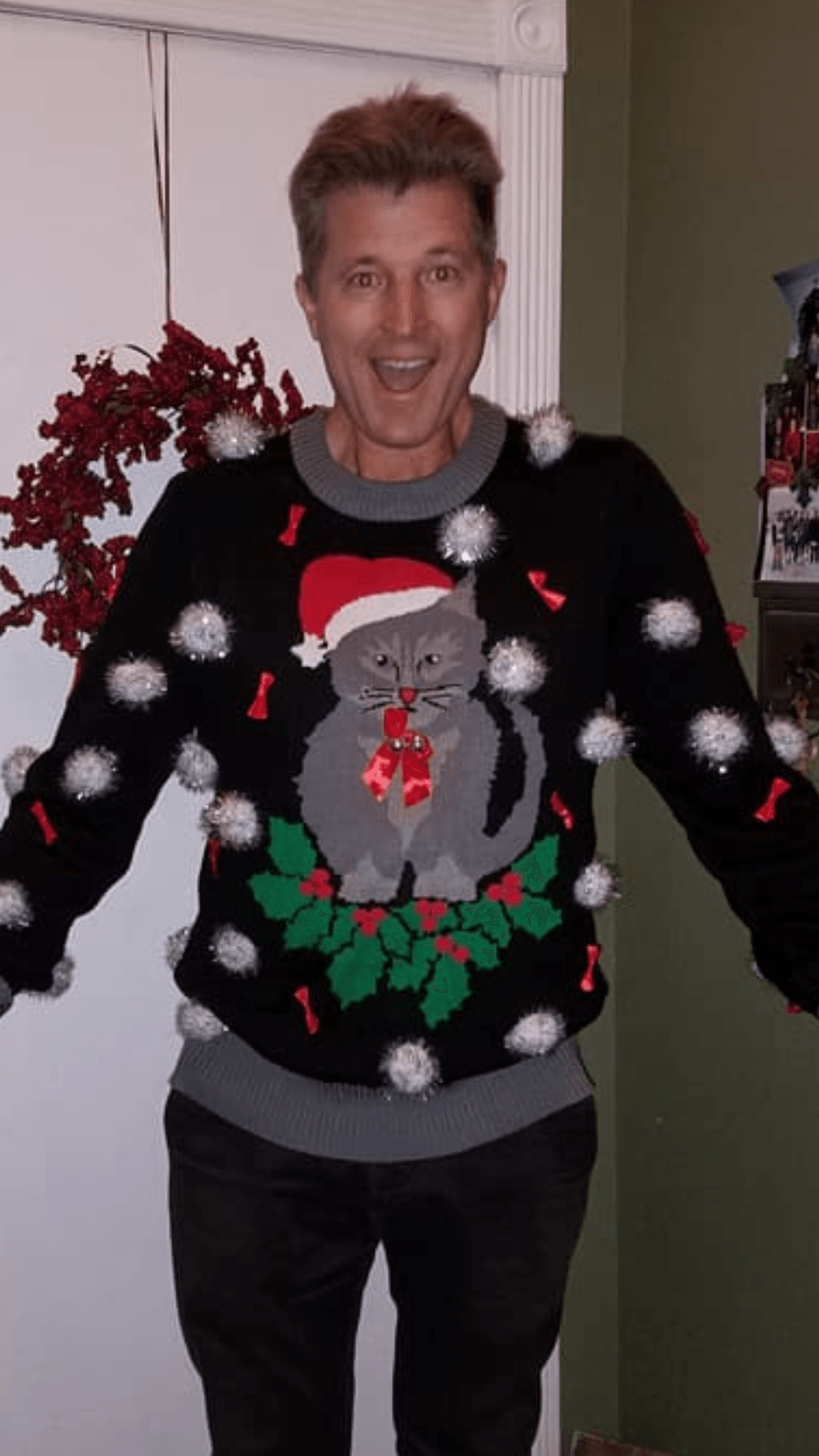 "My goal was to find the ugliest and tackiest Christmas holiday sweater, and I think I nailed it. Plus, I'm extremely allergic to cats...achoo!"